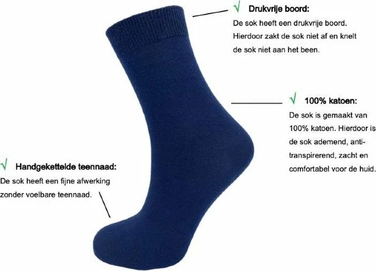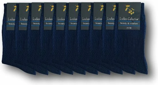 Set van 10 paar damessokken in de kleur donkerblauw. Deze fijne dunne dames sokken zijn gemaakt van 100% katoen waardoor de sokken extra zacht aanvoelen. Deze damessokken zijn ademend, anti-transpirerend en hebben een handgekettelde afwerking zonder voelbare naad op de tenen. De elastische niet knellende boord zorgt voor een optimaal draagcomfort. Deze damessokken zijn verkrijgbaar in de maten maten 35-38 en 39-42.