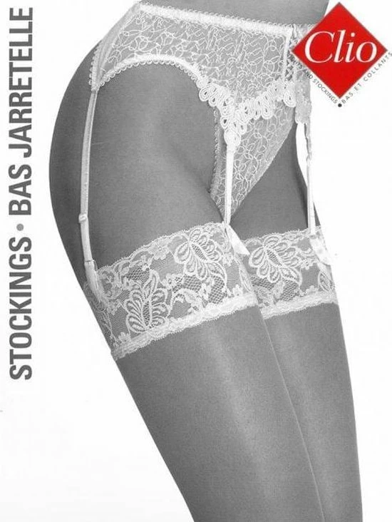 Deze 15 denier lace top Kousen uit de Clio Sexy Chic collectie zijn prachtige pure, semi-briljante kousen met een prachtig breed kanten boord (8 cm). Deze stockings zijn vervaardigd van 88% polyamide en 12% elastane voor de stretch. Het zijn Witte kousen voor jarretels.