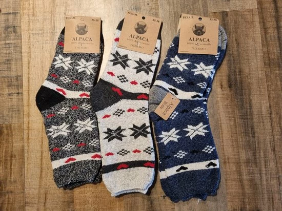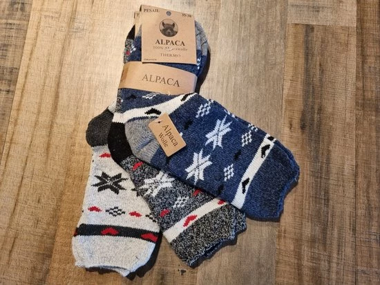 3 Paar 100% Alpaca Wollen Sokken in de kleuren Donkergrijs, Wit/Grijs en Blauw/Grijs. Maat 35-38. Thermo. Leuk als Sinterklaas Geschenk of als Kerstgeschenk. Sokken bestaan uit 100% Alpaca Wolzijn dus heerlijk zacht en warm om te dragen.