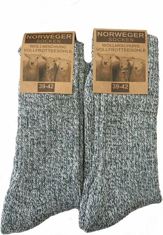 Noorse Wollen Sokken. Set van 3 paar noorse sokken Nooit meer koude voeten met deze noorse sokken die je voeten heerlijk warm en droog houden. Dankzij de unieke samenstelling van materiaal zijn deze sokken zeer comfortabel en sterk van kwaliteit. Anti transpiratie door hoog katoen/wol gehalte. * Geen snijdende boord * Materiaal: 30% katoen, 28% wol, 25% plyacril, 17% polyamide * Verkrijgbaar in de maten 39-42, 43-46 en 46-48.