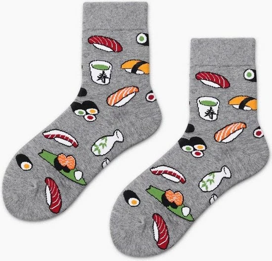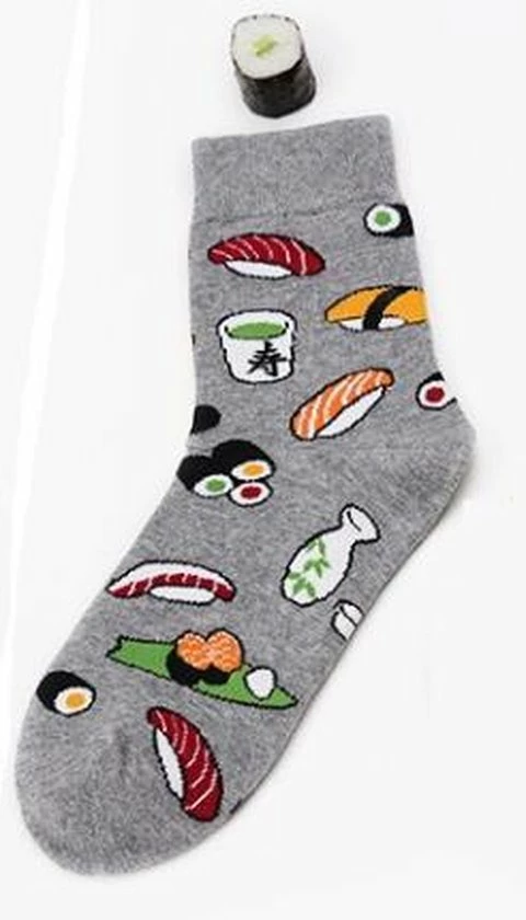 Te gekke sushi sokken kleur Grijs. De bovenkant van deze sokken ligt ong 10 cm vanaf de hiel. Maat 36 tot 41. Voor iedereen die van leuke sokken houdt!
