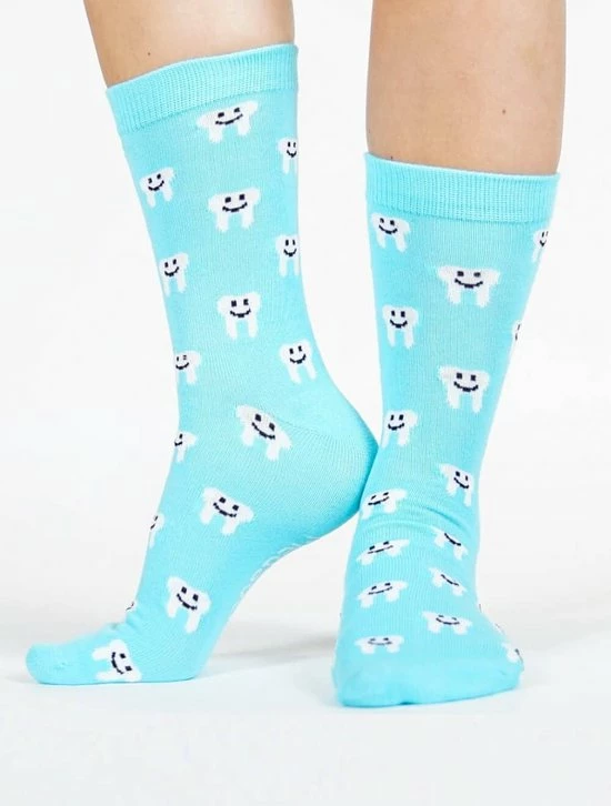 Dit zijn de leukste vrolijke tandensokken die er zijn. Het mooie clinische lichtblauw past goed bij de stralende witte tandjes die naar je lachen.