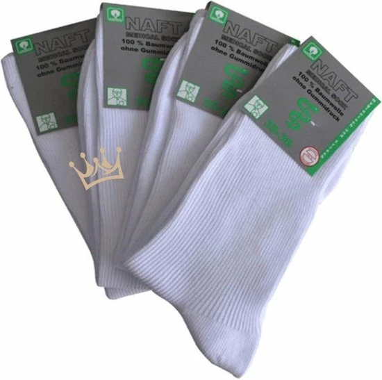 De medische / apothekers sokken zijn 100% katoen en daar door dus ook anti bacterieel, en anti transpiratie. Deze sokken hebben net zoals alle andere medische sokken geen elastiek in het boord. Afzakken doen deze inprincipe niet, door de ribbels in het boord. Deze sokken zijn leverbaar van maat 36/38, 39/42, 43/46, 47/49. Deze set sokken bestaat uit 4 paar mooie nette witte sokken. Zijn zonder voelbare teen naad en van 100 procent katoen. Dus uitermate geschikt voor mensen die een voelbare teen naad vervelend vinden of het naadje niet kunnen verdragen. Medical (medische) sokken, ook wel diabetes sokken of apotheker sokken genoemd, zijn anders dan normale sokken door bijvoorbeeld dat er geen elastiek in de boord zit, dat dus de boorden niet knellen, ze zijn extra wijd en dus voor mensen met bijvoorbeeld diabetes, oedeem, zwellingen, reuma of circulatie problemen. Deze sokken hebben een zeer goede prijs/kwaliteits verhouding. Mede door dat ze in een voordelig 4Pack worden geleverd kunnen wij deze prijzen hanteren. Deze sokken zijn al jaren een vertrouwd product met vele tevreden klanten.