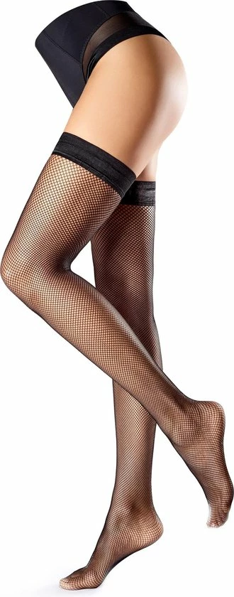 Fishnet stay-up kous met een kleine net-optiek en een glanzende boord. Deze boord is aan de binnenzijde voorzien van meerdere siliconen strips, waardoor de kous perfect blijft zitten.