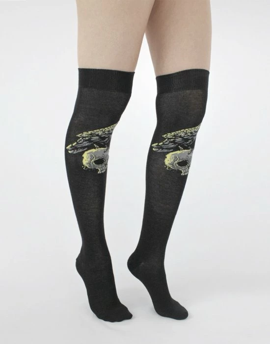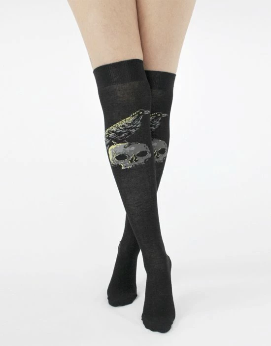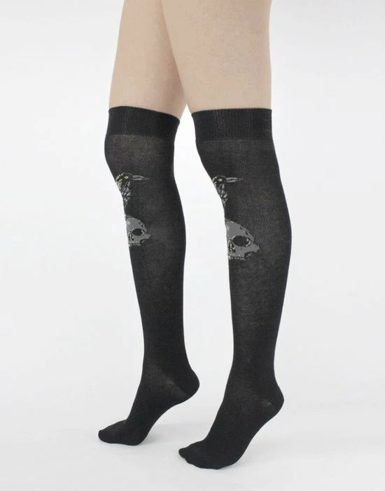 Pamela Mann. Geweldige over de knie sokken in alternatieve stijl met een gebreide print van een schedel met raaf.