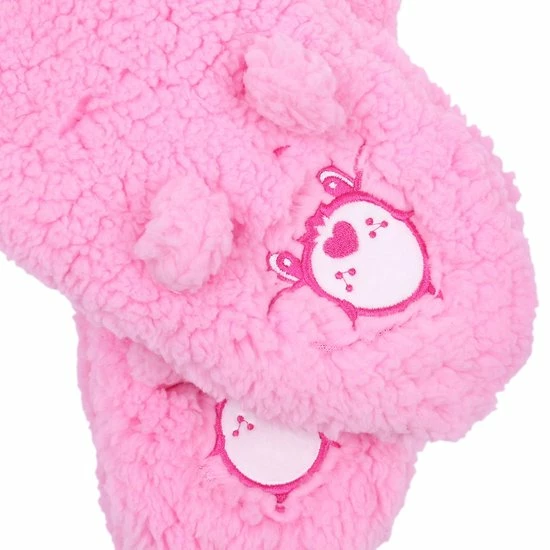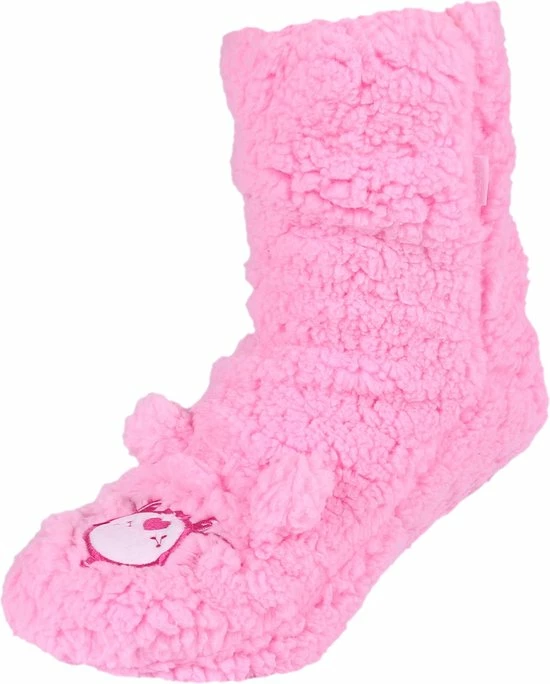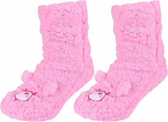 Roze sokken met het motief van een van de Troetelbeertjes, allemaal gemaakt van zacht, pluizig materiaal.