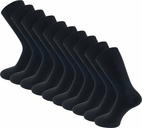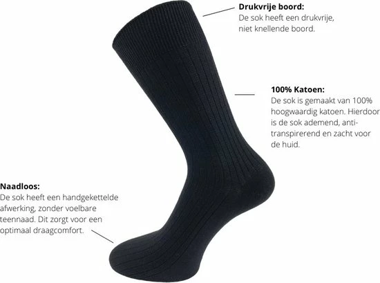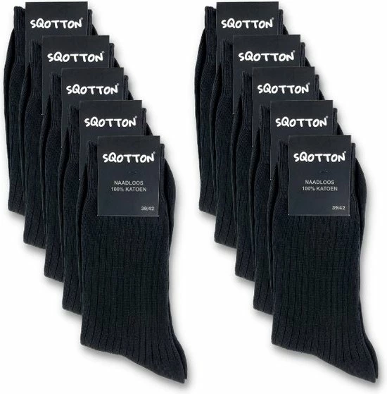 Set van 10 paar dunne ribgebreide sokken van het merk SQOTTON® in de kleur zwart. Deze sokken zijn gemaakt van 100% hoogwaardig katoen waardoor de sokken extra zacht aanvoelen. Sokken van katoen zijn dunner dan sokken die zijn gemaakt van een katoenmix. Katoenen sokken zijn ademend, anti-transpirerend en zeer huidvriendelijk. Dankzij de ribgebreide structuur en de drukvrije boord hebben de sokken een soepele, niet knellende pasvorm. De sokken hebben een handgekettelde afwerking waardoor de naad bovenop de tenen niet voelbaar is. Dit wordt ook wel naadloze sokken genoemd. Dankzij het materiaal, de soepele pasvorm en de naadloze afwerking zijn deze sokken zeer geschikt voor diabetici. De sokken worden geleverd per 10 paar en zijn verkrijgbaar in verschillende maten.